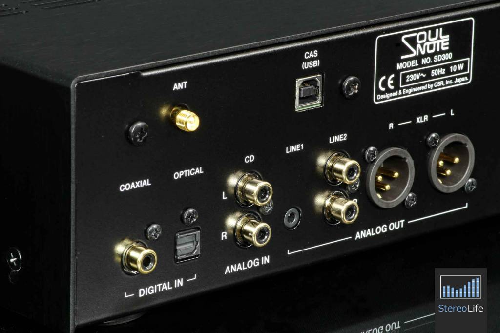 Z tyłu mamy cyfrowe wejście optyczne, koaksjalne i USB, jedno wejście analogowe (opisane jako gniazdo dla odtwarzacza CD, aczkolwiek sam chętniej podłączyłbym takowy przez kabel koaksjalny, a wejście analogowe zostawił na przykład dla gramofonu), a do tego wyjście analogowe w trzech formach - na gniazdach RCA, XLR i pojedynczym 3,5 mm. Oprócz tego na zapleczu mamy trójbolcowe gniazdo zasilające i złącze dla dołączonej do kompletu anteny Bluetooth. Powiecie, że to nie po audiofilsku słuchać muzyki z tabletu i to jeszcze bezprzewodowo? Owszem, nie da się ukryć ze Bluetooth ma swoje ograniczenia, ale dzięki niemu można chociażby puścić przez kolumny dźwięk z laptopa - bez względu na to czy słuchamy gęstych plików, czy akurat kumpel przesłał nam przez Facebooka link do teledysku zamieszczonego na YouTubie. Nawet jeśli macie srebrne kable, koszulkę z okładką "Dark Side of the Moon", kota, gramofon, zardzewiały samochód, siwą brodę, dywan w tulipany i inne obowiązkowe atrybuty prawilnego, ortodoksyjnego audiofila, to nie uwierzę że nigdy w życiu nie słuchaliście muzyki z YouTube'a, Vimeo, SoundClouda lub innego serwisu, dla którego jakość dźwięku nie jest priorytetem. Dlatego mając SD300 możemy sobie podłączyć komputer do gniazda USB i słuchać gęstych plików z komputera, możemy też podłączyć zewnętrzny streamer lub odtwarzacz CD i cieszyć się wysoką jakością brzmienia, ale gdy wpadnie do nas kumpel i będzie chciał na szybko pokazać nam coś na tablecie, w ciągu dziesięciu sekund puścimy dźwięk przez kolumny.
