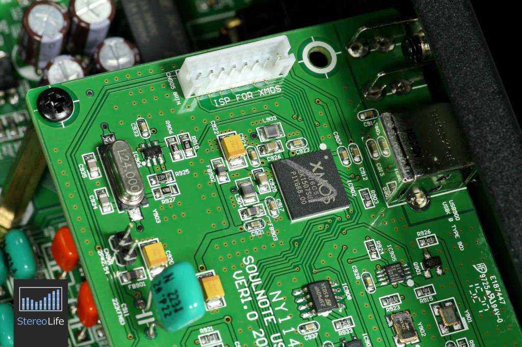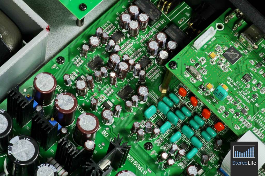 Wnętrze zabudowano elektroniką niemalże do ostatniego centymetra, z czytelnym podziałem na część cyfrową i analgową, wzmacniacz słuchawkowy i zasilacz zbudowany w oparciu o transformator R-Core o niskim rozproszeniu strumienia magnetycznego, co zdaniem producenta gwarantuje cichą i stabilną pracę urządzenia. Sekcja analogowa to właściwie pełna symetria, co szczególnie dobrze widać w pobliżu wyjść RCA i XLR. Co ciekawe, maksymalny poziom wyjściowy na tych gniazdach jest stosunkowo wysoki - odpowiednio 4,2 i 8,4 V. Oznacza to, że przy maksymalnej głośności SD300 będzie grał głośniej, niż typowe źródła. Wewnątrz zastosowano układy NJW1194V (New Japan Radio) oraz wzmacniacz operacyjny MUSE8920, a także cenione przez audiofilów kondensatory firmy ELNA. Obudowę w całości wykonano z metalu i osadzono na czterech solidnych nóżkach. Co ciekawe, w komplecie znajdziemy także kolce, które można wkręcić w specjalne gniazda rozstawione nieco szerzej - kolce mają oczywiście tłumić rezonanse pomiędzy podłożem a urządzeniem.