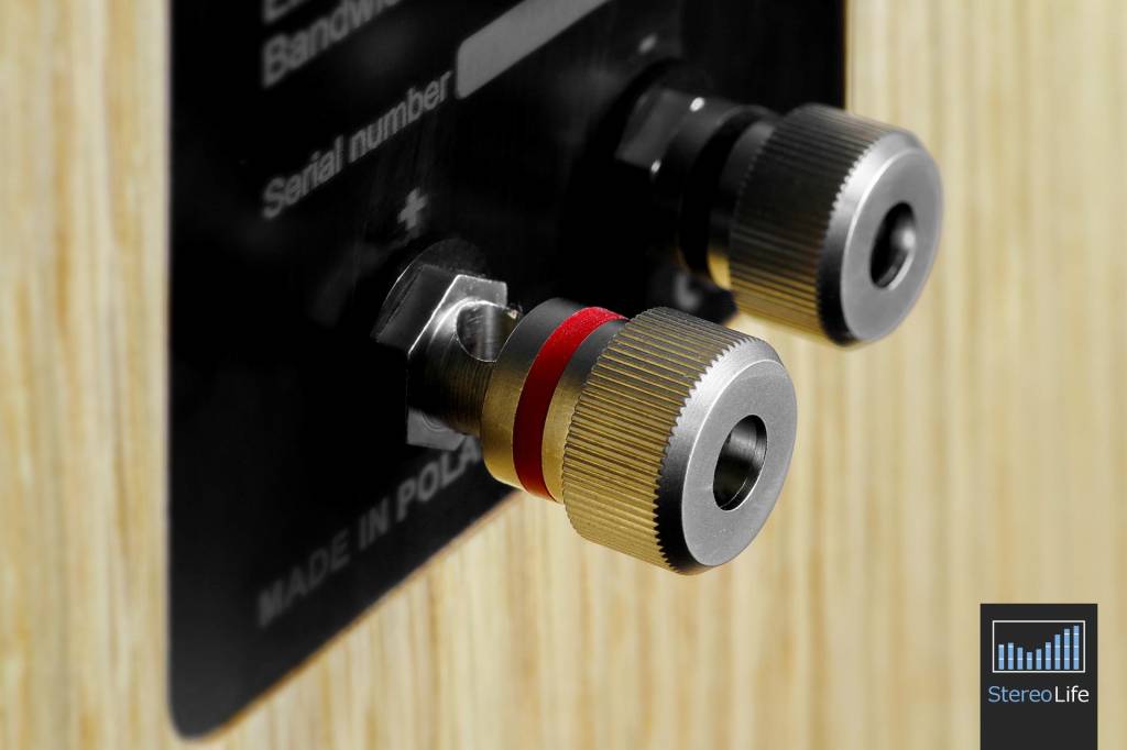 Metalową siateczką zabezpieczony jest jeszcze jeden element znajdujący się na przedniej ściance - szeroki wylot tunelu wentylacyjnego. Ponieważ rozwiązanie automatycznie skojarzyło mi się z kolumnami takich marek, jak PMC czy T+A, zacząłem się zastanawiać czy Ruby 25 mkII przypadkiem nie otrzymały obudowy z linią transmisyjną. W tym przedziale cenowym byłby to prawdziwy ewenement. Okazuje się jednak, że nie mamy tu do czynienia ze skomplikowanym labiryntem, a jedynie szerokim wylotem bass-reflexu. Jego wnętrze zostało wykończone fornirem - dokładnie tak samo, jak pozostała część obudowy. To sprytny zabieg, dzięki któremu można odnieść wrażenie, że mamy do czynienia z jednolitym, drewnianym bloczkiem. Moim zdaniem tunel rezonansowy mógłby też zostać zamalowany na czarno, co pewnie byłoby mniej czasochłonne. Tak czy inaczej, jest to zdecydowanie bardziej eleganckie rozwiązanie niż plastikowa rura przez którą widać ściśniętą w środku wełnę lub gąbkę. Spodobały mi się też gniazda - porządne, masywne, szeroko rozstawione, zamontowane na czarnej, błyszczącej tabliczce znamionowej. Ale w wyższych modelach Pylona to akurat standard.