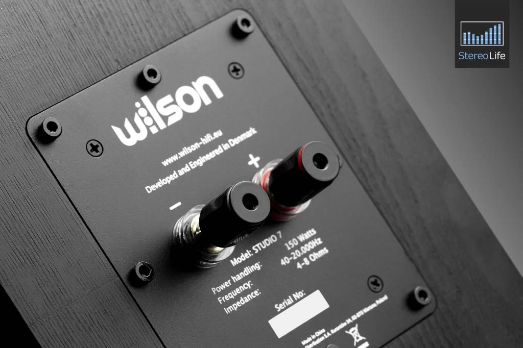 Wilson Studio 7 to dwudrożne kolumny podłogowe w obudowie wentylowanej, zbudowane w oparciu o trzy przetworniki pracujące w układzie D'Appolito. Jak informuje producent, najbardziej charakterystycznym elementem jest tutaj przetwornik wysokotonowy z 28-minimetrową, miękką kopułką osadzoną w dużym, 5-calowym falowodzie z włókna szklanego. Tweeter wykorzystuje mocny magnes neodymowy i zaczyna pracę przy 2,8 kHz. Niższe częstotliwości są domeną dwóch 5-calowych głośników średnio-niskotonowych, które wyposażono w odlewane aluminiowe kosze, membrany z Kevlaru i magnesy o masie ponad 280 g (sztuka). Obudowy wykonano z płyt MDF i oklejono winylową folią w kolorze czarnego dębu lub drewna orzechowego. W obu wersjach różnią się też kolce i maskownice. W wariancie czarnym mamy srebrne kolce i czarne grille, a jeśli wybierzemy okleinę orzechową, otrzymamy złote kolce i beżowe osłony głośników. Firma podkreśla, że niewielkie rozmiary maskownic ułatwiają ich składowanie, gdy nie są używane, co w tradycyjnych konstrukcjach bywa kłopotliwe dla użytkowników. Z tyłu obudowy w dolnej jej części umieszczony jest aluminiowy panel z osadzonymi na wprost, pojedynczymi terminalami o pozłacanej powierzchni styków. Terminale z dużymi, przezroczystymi nakrętkami z oznaczeniem polaryzacji mają ułatwiać mocowanie kabli. Całość została osadzona bardzo nisko, dzięki czemu przewody nie będą wisiały w powietrzu, a wyjątkowym estetom będzie łatwiej je ukryć lub zamaskować. Jeśli chodzi o parametry, z pewnością warto zwrócić uwagę na wysoką skuteczność, wynoszącą 91 dB. Impedancja podawana jest nie jako wartość, lecz przedział 4-8 Ω. Myślę, że niedoświadczonych klientów taka informacja będzie tylko niepotrzebnie rozpraszać, więc umówmy się, że Studio 7 są kolumnami 4-omowymi. Dla większości użytkowników i tak nie ma to żadnego znaczenia, bowiem zdecydowana większość dostępnych na rynku wzmacniaczy poradzi sobie tak samo dobrze z kolumnami 4-omowymi, jak z 8-omowymi.