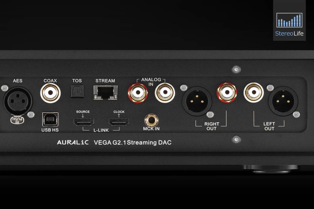 Jeśli chodzi o wyposażenie i wygląd tylnej ścianki, Vega G2.1 nie różni się od swojej poprzedniczki niczym poza umiejscowieniem śrub, co wymusiła oczywiście inna konstrukcja obudowy. Każde jedno gniazdo jest takie samo i znajduje się w tym samym miejscu. Niektórzy mogą narzekać na brak łączności bezprzewodowej, ale nie chce mi się wierzyć, że audiofilom skłonnym wydać niemal trzydzieści tysięcy złotych na streamer nie będzie się chciało podłączyć go do sieci za pomocą kabla. Wygoda wygodą, ale takie połączenie jest pewniejsze, szybsze i bardziej stabilne. Trzeba przyznać, że Vega - zarówno w serii G1, jak i G2.1 - to po prostu świetny pakiet, w którym dostajemy streamer, przetwornik i przedwzmacniacz, a nawet dwa wyjścia słuchawkowe. W tańszym modelu przedwzmacniacz to tak naprawdę regulowane wyjście, bo nie mamy możliwości podłączenia żadnego źródła analogowego. W testowanym urządzeniu otrzymujemy natomiast wejście RCA, które może wiosny nie czyni, ale w niektórych sytuacjach może wystarczyć do tego, aby kupno zewnętrznego przedwzmacniacza stało się kompletnie niepotrzebne. Powiedzmy, że nasz system składa się z Vegi G2.1, stereofonicznej końcówki mocy i zestawów głośnikowych, a pewnego dnia przychodzi nam do głowy pomysł rozszerzenia zestawu o gramofon i phono stage. Głupota? Wcale nie. A z Vegą G1 tego nie zrobimy. Sygnał analogowy możemy odebrać za pomocą gniazd RCA lub XLR. Cieszy także mnogość, a przede wszystkim różnorodność wejść cyfrowych. Nie można również nie wspomnieć o firmowym złączu Lightning Link. Firmowy protokół transmisji danych umożliwia połączenie kilku urządzeń Auralica w jeden system, co tym razem jest o tyle kuszące, że na rynku jednocześnie pojawiły się wszystkie cztery modele z oznaczeniem G2.1 (lub GX.1, w przypadku zegara taktującego Leo). Producent nie zapomniał o posiadaczach klocków z serii G2. Mają one być produkowane jeszcze przez jakiś czas, oczywiście na indywidualne zamówienie.