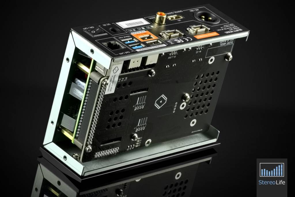 Pokrywa urządzenia jest ażurowa, co sugeruje, że kluczową kwestią było chłodzenie znajdujących się wewnątrz układów elektronicznych. Co szczególnie istotne, M1T nie ma żadnych wiatraczków ani dysku twardego, dzięki czemu pracuje bezszelestnie. Tylna ścianka jest oczywiście mocno zabudowana. Gniazdo LAN i cztery porty USB wyglądają mocno "malinkowo". Tuż obok umieszczono dwa nietypowe złącza opisane jako M-Link oraz M-IO do, jak to napisał producent, podłączenia sprzętu peryferyjnego. Najważniejsze z punktu widzenia audiofila są trzy wyjścia cyfrowe - koaksjalne, I2S i AES/EBU. W połączeniem z szerokim wachlarzem gniazd USB daje to naprawdę duże pole manewru w kwestii podłączenia przetwornika. Oprócz tego na tylnej ściance znajdziemy jeszcze gniazdo zasilające z mechanicznym włącznikiem. Dzięki temu można łatwo wyłączyć sprzęt na czas dłuższej nieobecności w domu albo, jeśli ktoś chce być świętszy od papieża, przed przepinaniem kabli. Warto wspomnieć, że w sprzedaży dostępne są dwie wersje tego transportu - z wbudowaną pamięcią o pojemności 2 lub 8 GB. Pierwszą wersję producent poleca miłośnikom streamingu, którzy nie planują korzystać z plików najwyższej gęstości DSD, a korzystają przede wszystkim z internetowych serwisów muzycznych, takich jak TIDAL, Spotify, Qobuz czy Amazon Music. Odmiana z pamięcią 2 GB bez problemu obsłuży wszystkie pliki dostępne w streamingu. Wersja 8-gigabajtowa przyda się tam, gdzie urządzenie będzie również transportem plików wysokiej gęstości DSD. Różnica w cenie jest niestety spora. Tańszy M1T kosztuje 4199 zł, a ten bardziej wypasiony - 4990 zł. Osiem stówek dopłaty, podczas gdy dobrą, 8-gigabajtową pamięć RAM można kupić za 60-100 zł? Dla mnie to przesada i coś mi się wydaje, że Silent Angel zapatrzył się tutaj na producentów smartfonów. Dobrze, że nie trzeba dopłacać jeszcze 300 zł za zasilacz i 100 zł za kabelek.