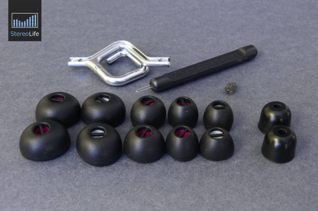 W woreczkach z akcesoriami znajdziemy też coś ciekawego - miniaturowe kawałki gąbki i plastikowy patyczek zakończony zaokrąglonym drucikiem, przeznaczony prawdopodobnie do ich demontażu. Sennheiser chyba nie chwali się tym rozwiązaniem, ponieważ ciężko znaleźć na ten temat jakiekolwiek informacje na stronach sklepów ze sprzętem, a nawet w materiałach prasowych producenta. Często opisywane jest eleganckie wzornictwo i wysokiej jakości materiały, z jakich wykonano słuchawki, ale na temat mikroskopijnych gąbeczek i równie małego narzędzia zbrodni - cisza. Po kształcie gumeczek, jakie w momencie otwierania opakowania były przymocowane do słuchawek zorientowaliśmy się, na czym ten system polega. Otóż wewnątrz gumeczek, w otworze od strony ucha, zobaczymy maleńkie przegrody. Kawałki gąbki możemy delikatnie wsunąć do kanałów w słuchawkach - tych, na które zakłada się gumeczki. Wąskie poprzeczki najwyraźniej zabezpieczają je przed wypadnięciem, choć i tak wydaje się to mało prawdopodobne. Oczywiście nie musimy wypełniać kanałów gąbeczkami, pozostawiając je całkowicie pustymi. Najwyraźniej jest to rozwiązanie mające umożliwić nam delikatne wpływanie na brzmienie słuchawek. Operacja wymaga jednak nieco cierpliwości i sprytu, więc polecamy przeprowadzać ją w komfortowych warunkach i przy dobrym świetle. Demontaż gąbeczek za pomocą dołączonego do kompletu chwytaka jest łatwiejszy, aczkolwiek jeśli go zgubicie - nie ma dramatu. Gąbki można spokojnie wyjąć za pomocą najzwyklejszej igły lub nawet wykałaczki.