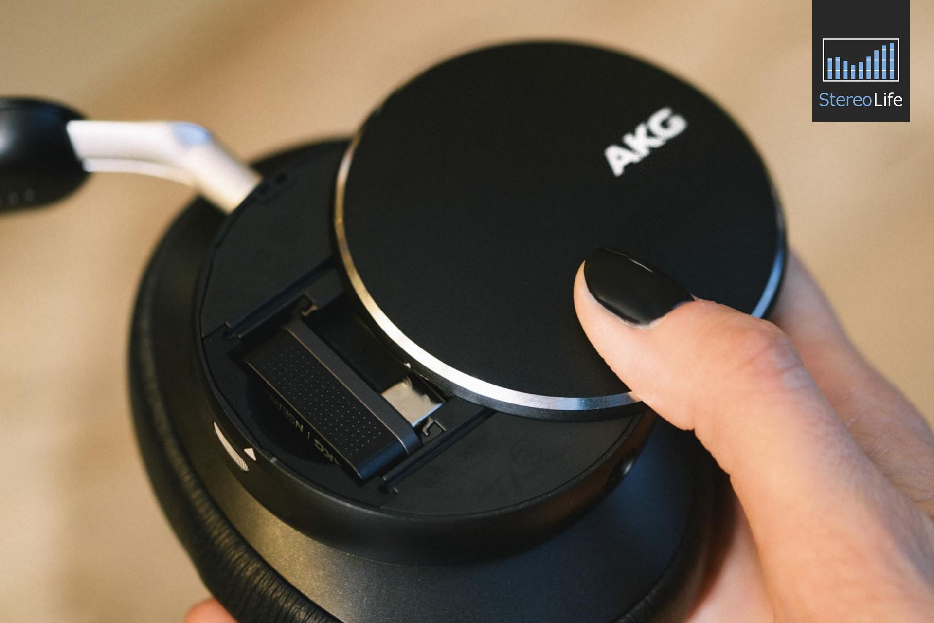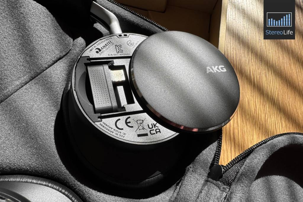 Pod kątem użytkowym AKG również poszedł w minimalizm. Na lewej muszli mamy skrytkę na dongla, przycisk ambient, dwa mikrofony (czyli razem jest ich sześć) oraz wyjście mini jack. Prawa muszla ma slider służący do włączania urządzenia oraz uruchamiania parowania, przycisk pauzy oraz wyjście USB-C. Zmianę poziomu głośności ukryto w panelu, który można minimalnie przekręcić zgodnie lub przeciwnie do ruchu wskazówek zegara. Funkcjonalnościami przycisków można sterować za pomocą aplikacji. Pałąk (który wygląda na metalowy) ma stopniowaną regulację długości ramion, dzięki czemu słuchawki same z siebie nie powinny zmienić rozmiaru. Regulacja jest wystarczająca, ale widywałem już większe zakresy i myślę, że osobom o dużych głowach lub bardzo bujnych fryzurach może być trochę za ciasno w tym modelu, chociaż w moim przypadku pozostawało jeszcze trochę zapasu. Od wewnętrznej strony w rynience ukryty jest kabel, który jest w ten sposób dobrze zabezpieczony przed ewentualnymi uszkodzeniami mechanicznymi. Widać zatem, że model N9 Hybrid spełnia wszystkie funkcje słuchawek nauszynych, a że nie ma tu świecidełek, dziesiątek przycisków, pokrętełek, naturalnej skóry, metalu, tytanu czy włókna węglowego - w tej cenie raczej się tego nie spodziewałem i niekoniecznie trzeba od razu uznawać za wadę. Jest tu skromnie. ale z klasą. Słuchawki jakoś specjalnie nie rzucają się w oczy i mi się to podoba.