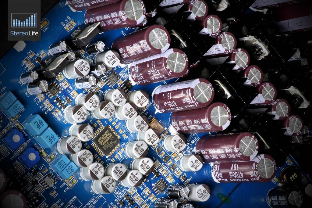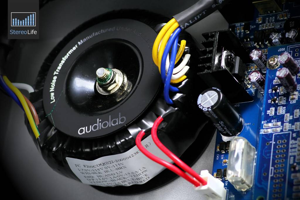 Audiolab 8300CD jest rozbudowanym odtwarzaczem płyt kompaktowych mogącym pracować również jako przetwornik cyforowo-analogowy oraz przedwzmacniacz, w którym jednak nie ma możliwości podpięcia źródeł analogowych. Taką możliwość daje za to model 8300CDQ. Sercem obu modeli jest DAC ESS Sabre 9018, który zresztą był też montowany w serii 8200. Czym więc się technicznie różni 8300CD od swojego poprzednika? Najważniejszą zmianą jest możliwość odtwarzania plików wysokiej rozdzielczości poprzez gniazdo USB oraz podniesienie maksymalnych częstotliwości próbkowania sygnałów wejściowych do 384 kHz przy rozdzielczości 32 bitów. Dodatkowo odtwarzacz przyjmuje również sygnał DSD w jakości DSD64, DSD128 i DSD256 i w związku z tym sekcja cyfrowa została rozszerzona o cztery dodatkowe filtry dedykowane do odtwarzania DSD. Dodatkowo, podczas pracy z zewnętrznymi komponentami podpiętymi przez USB (mam tu na myśli na przykład komputer lub odtwarzacz plików), można za pomocą pilota sterować ich pracą dzięki kompatybilności ze standardem HID. Wnętrze urządzenia wygląda bardzo interesująco. Nawet po zdjęciu pokrywy mocowanej za pomocą dziesięciu śrub, zobaczymy czarną belkę wzmacniającą, biegnącą od przedniej do tylnej ścianki. Wyraźnie widać, że inżynierom Audiolaba zależało na usztywnieniu obudowy w celu minimalizacji szkodliwych rezonansów. Niemal wszystkie układy elektroniczne, za wyjątkiem napędu i transformatora toroidalnego, zmieściły się na jednej, dużej płytce drukowanej. Praktycznie połowę jej powierzchni zajmuje sekcja zasilacza. Reszta to gęsto zabudowany moduł z przetwornikiem, przedwzmacniaczem i układami wyjściowymi. Ciekawostką jest umiejscowienie toroidu. Konstruktorzy woleli poprowadzić przewody najpierw od gniazda zasilającego do niego, a później znów od trafa do prostowników znajdujących się bliżej przedniej ścianki urządzenia, niż ustawiać transformator w pobliżu wrażliwych na zakłócenia obwodów cyfrowych i analogowych.