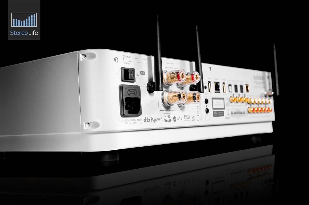 Przedni panel jednoczęściowego Audiolaba zaprojektowany został w sposób bardzo oszczędny. W jego środkowej części umieszczono duży, kolorowy wyświetlacz. Poza nim mamy tu tylko sześć przycisków - jeden duży i pięć mniejszych, napęd optyczny z wysuwaną tacką (miłośnikom kompaktów spodoba się to bardziej niż transport szczelinowy), diodę sygnalizacyjną, wejście słuchawkowe oraz odbiornik podczerwieni. Wspomniane przyciski uruchamiają najważniejsze funkcje urządzenia, więc w ostateczności można poradzić sobie nawet bez pilota. Mamy tu oczywiście włącznik, regulację głośności, przejście do kolejnego utworu (brak przycisku przełączania wstecz), stop i wysuwanie tacki oraz wybór wejścia. Ciekawie zaczyna się robić, gdy zajrzymy na tylną ściankę urządzenia. Poza standardami, takimi jak włącznik zasilania, mamy tu wejścia - trzy analogowe, jedno gramofonowe (MM), bezpośrednie wejście do końcówki mocy, dwa gniazda koncentryczne, dwa optyczne, jedno opisane jako DTS Play-Fi Streaming, jedno USB-B oraz wyjścia - analogowe wyjście pre-out, słuchawkowe, wyzwalacz i oczywiście terminale głośnikowe. Wszystko to sprawia, że przy niewielkim nakładzie pracy możemy połączyć Omnię z innymi sprzętami w domu i stworzyć kombajn, który nie tylko będzie odtwarzał nam muzykę strumieniowo lub z płyt CD, ale też zastąpi soundbar przy oglądaniu telewizji.