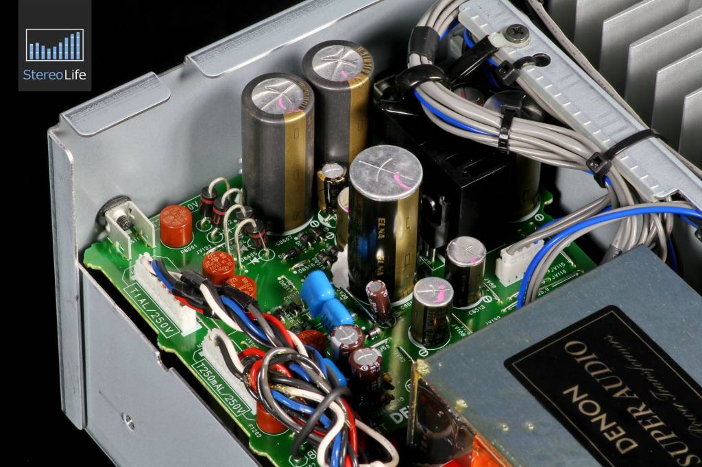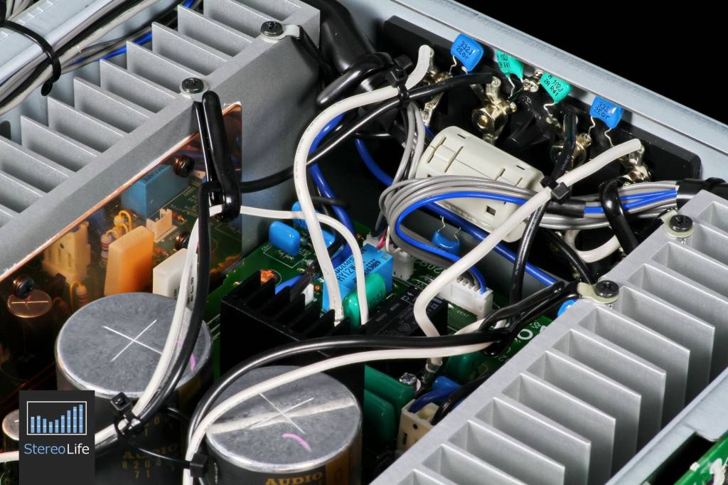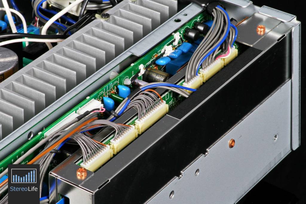 Po co ta cała przydługa historia? Ano po to moi drodzy, abyście uświadomili sobie jak niecodziennym posunięciem ze strony Denona było wypuszczenie na rynek wzmacniacza zbudowanego w stu procentach zgodnie z tą "przestarzałą" technologią. Jeśli mam być szczery, dawno nie widziałem wzmacniacza w cenie poniżej dziesięciu tysięcy złotych, który robiłby takie wrażenie zarówno z zewnątrz, jak i od środka. Dla amatora klasycznych tranzystorowców, widok wnętrza PMA-1600NE jest tym, czym dla maniaka motoryzacji może być wpatrywanie się w silnik, no może nie Ferrari, ale przynajmniej Forda Mustanga lub Nissana GT-R. Piękna rzecz. Wnętrze jest pięknie podzielone na trzy części - zasilanie, końcówki mocy i sekcję wejściową. W pierwszym "pokoiku" widzimy dwa duże transformatory, w drugim długie, pionowe radiatory i całkowicie lustrzane obwody dla kanału lewego i prawego, a w trzecim na pierwszy rzut oka niewiele widać, za to z całą pewnością można stwierdzić, że mimo obecności radiatora, sekcja ta również została oddzielona od reszty za pomocą metalowej płytki biegnącej od panelu frontowego do tylnej płyty z gniazdami. Kiedy zobaczyłem to zdjęcie w materiałach prasowych jakiś miesiąc temu, aż nie mogłem uwierzyć, że da się jeszcze w taki sposób zrobić wzmacniacz, i to wciąż za w miarę rozsądne pieniądze. Jasne - jak przystało na japoński klocek, jest tu też trochę kabelków, ale dla mnie nie ma w tym nic złego. Na pewno wolę to, niż takie pięknie zmontowane "nic", jak w niektórych super nowoczesnych wzmacniaczach dających na wyjściu więcej mocy, niż pobierają z gniazdka.