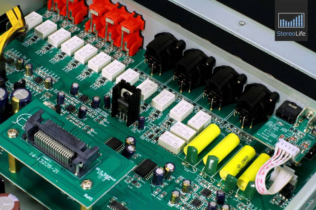 I32 to droższy z dwóch wzmacniaczy zintegrowanych dostępnych w aktualnej ofercie firmy Primare. W stosunku do produkowanego wcześniej modelu I31 jest to zupełnie nowa konstrukcja, w której zamiast klasycznych układów pracujących w klasie A/B mamy moduły UFPD (Ultra Fast Power Device) będące firmową adaptacją klasy D. Z punktu widzenia parametrów elektronicznych, korzyści są spore - dostajemy 120 W na kanał przy ośmiu omach i aż 230 W przy czterech, przy czym zużycie energii przy normalnej pracy ma się według producenta utrzymywać na poziomie 31 W. Nie pytajcie, w jaki sposób się to dzieje, bo nie mam zielonego pojęcia. Z pozostałych liczb ujętych w tabeli danych technicznych moją uwagę zwróciło też pasmo przenoszenia. Primare podaje tu przedział 10 Hz - 20 kHz, co w klasycznym wzmacniaczu tranzystorowym nie byłoby takim imponującym wynikiem, ale przy spadku rzędu 3 dB. Powyższe wartości uzyskano natomiast przy -0,5 dB, a to już robi wrażenie. Oczywiście wciąż uważam, że wielkiego związku z jakością brzmienia to nie ma, ale jeśli ktoś twierdzi, że klasa D nie ma żadnych zalet, to nie - najwyraźniej ma i to co najmniej kilka. Wewnątrz nie ma oczywiście wielkich i ciężkich transformatorów, ale gdyby były, na pierwszy rzut oka mógłbym stwierdzić, że mamy do czynienia z porządnym, tradycyjnym piecem. Nad płytką obsługującą wejścia zostawiono trochę miejsca na montaż karty MM30, która do standardowych możliwości integry dodaje funkcję streamera, przetwornika czy odbiornika Bluetooth z aptX. Z informacji producenta wynika, że tylko wejścia optyczne są ograniczone do 96 kHz - pozostałe pozwolą na transmisję sygnału w jakości do 192 kHz.