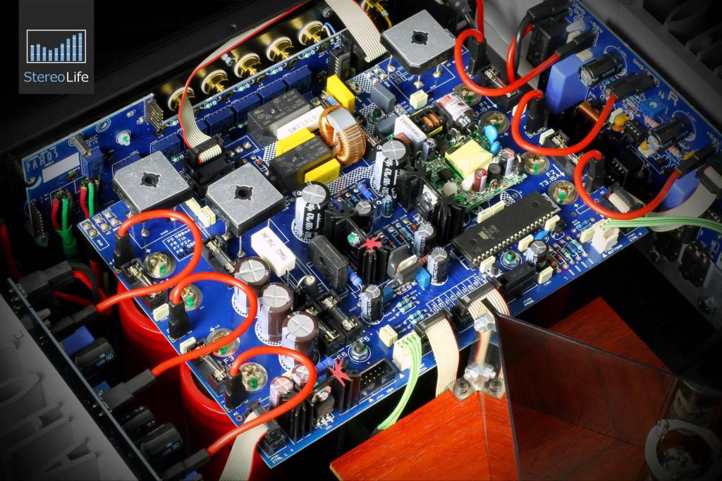 Pathos Logos MKII to hybrydowy, w pełni zbalansowany wzmacniacz zintegrowany o zerowym sprzężeniu zwrotnym i wysokiej mocy (110 W na kanał przy 8 Ω i 220 W na kanał przy 4 Ω). W sekcji przedwzmacniacza projektanci zastosowali lampy ECC88, do których dociera zbalansowany sygnał, co pozwala w pełni wykorzystać zalety zbalansowanych źródeł, takich jak Pathos Digit lub Pathos Endorphin. Układ regulacji głośności oparto na sterowanej cyfrowo drabince rezystorowej Burr-Brown PGA2310, a wyboru wejścia dokonujemy za pomocą miniaturowego przekaźnika opracowanego pierwotnie dla zastosowań profesjonalnych w branży telekomunikacyjnej. Stopień wejściowy zbudowano na bazie dwóch lamp 6922 Electro-Harmonixa. Stopień końcowy pracujący w klasie A/B jest konstrukcją dual-mono z mocno spolaryzowanymi tranzystorami MOS-FET i przewymiarowanym zasilaczem gwarantującym solidną rezerwę prądu. Wnętrze podzielono na kilka wyraźnych sekcji. Lampy zamontowano na ceramicznych podstawkach wmontowanych w drewnianą płytkę łączącą się z dużym elementem otaczającym potencjometr. Największą płytkę zamontowano z tyłu, tuż przy gniazdach. Znajdziemy tu również układ przetwornika cyfrowo-analogowego. Pod spodem czai się potężny transformator i równie imponujące, czerwone kondensatory marki Itelcond. Końcówki mocy przytwierdzono do radiatorów w pozycji pionowej. Producent informuje, że wersja MKII wprowadziła wiele udoskonaleń, jak podwyższone napięcie anodowej polaryzacji lamp, stabilizowane zasilanie lampowego przedwzmacniacza i inny rozkład kondensatorów elektrolitycznych wzdłuż ścieżki sygnałowej, szczególnie w pobliżu każdego tranzystorów. Jeśli chodzi o parametry, warto zwrócić uwagę na pasmo przenoszenia rozciągające się od 5 Hz do 140 kHz i to z odchyłką 0,5 dB. Zniekształcenia przy 1 W wynoszą 0,02%, zaś przy 110 W dochodzą do 0,2%. To i tak bardzo dobry wynik jak na hybrydę. Podobnie, jak stosunek sygnału do szumu, który według producenta nie spada poniżej 90 dB.