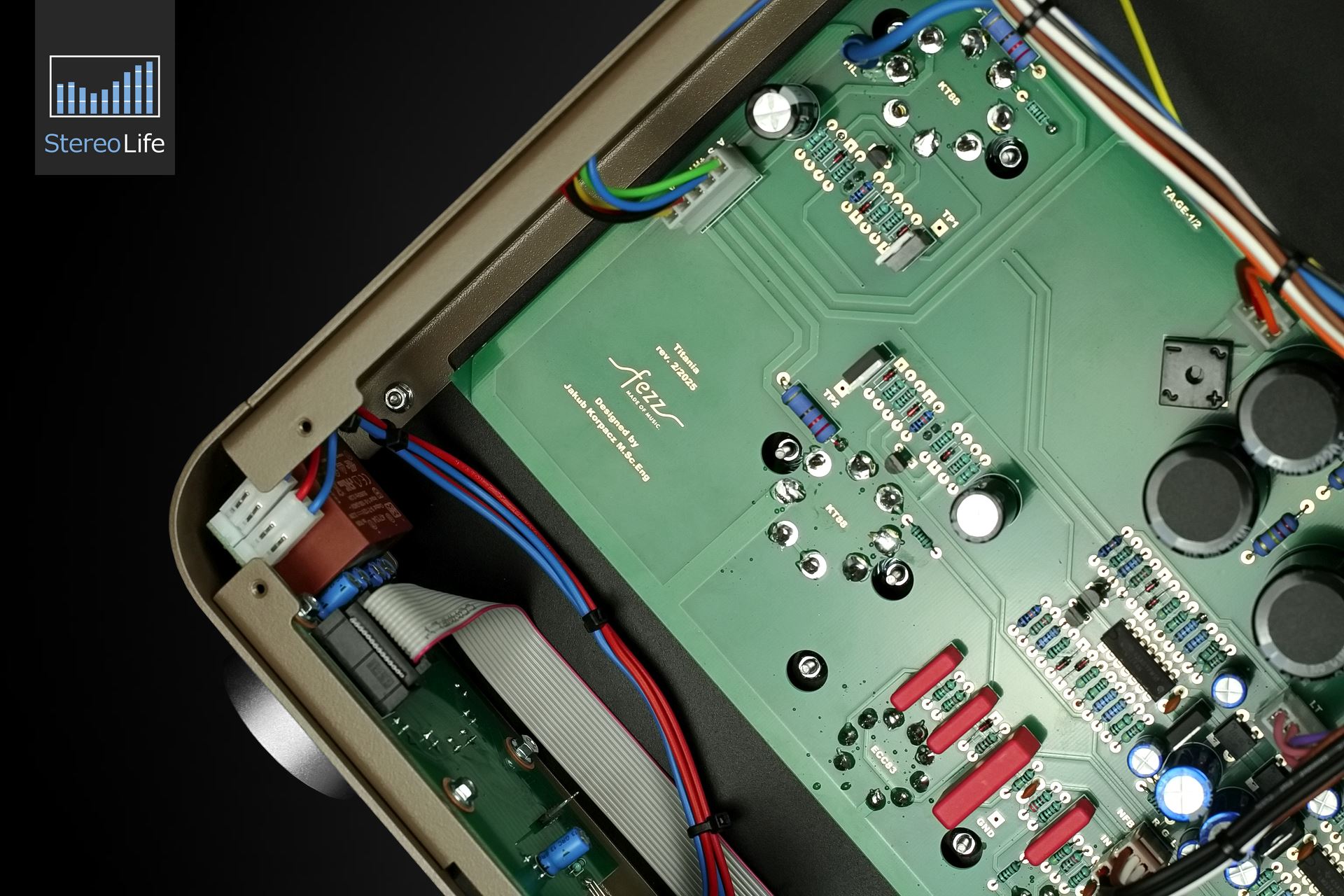 Równie istotna jest strona mechaniczna. Obudowę wykonano z grubej blachy stalowej, a cały wzmacniacz waży około 20,5 kg. To wartość spójna z gabarytami urządzenia i skalą zastosowanej sekcji transformatorowej. Wymiary wynoszą 420 mm szerokości, 380 mm głębokości i 200 mm wysokości. Oznacza to, że Titania MK2 pozostaje konstrukcją zwartą, ale zbudowaną wokół ciężkiego, klasycznego układu lampowego. Najlepszym dowodem wysokiej jakości wykonania jest to, co widzimy pod maską. Już w innych nowych modelach Fezza uwagę zwracała schludność montażu i uporządkowanie architektury wewnętrznej. Liczba przewodów została ograniczona do minimum, a cały układ sprawia wrażenie zaprojektowanego z dużą dyscypliną. To ważne, bo w sprzęcie lampowym łatwo ukryć niedoskonałości montażu za zasłoną tradycji i ręcznej produkcji. Tutaj nie ma takiej potrzeby. Titania MK2 wygląda jak urządzenie pomyślane od początku jako współczesny produkt. Od strony przyłączy sytuacja jest przejrzysta i sensowna. Do dyspozycji użytkownika oddano trzy wejścia liniowe RCA, gniazdo direct (bezpośrednie wejście do końcówki mocy), wyjście sub-out, terminale głośnikowe dla obciążeń 4 i 8 Ω oraz dwa sloty rozszerzeń FEBS. Pomyślano nawet o tym, aby maksymalnie odsunąć gniazdo zasilające od najbardziej wrażliwych na zakłócenia wejść analogowych. Nie mam zastrzeżeń.